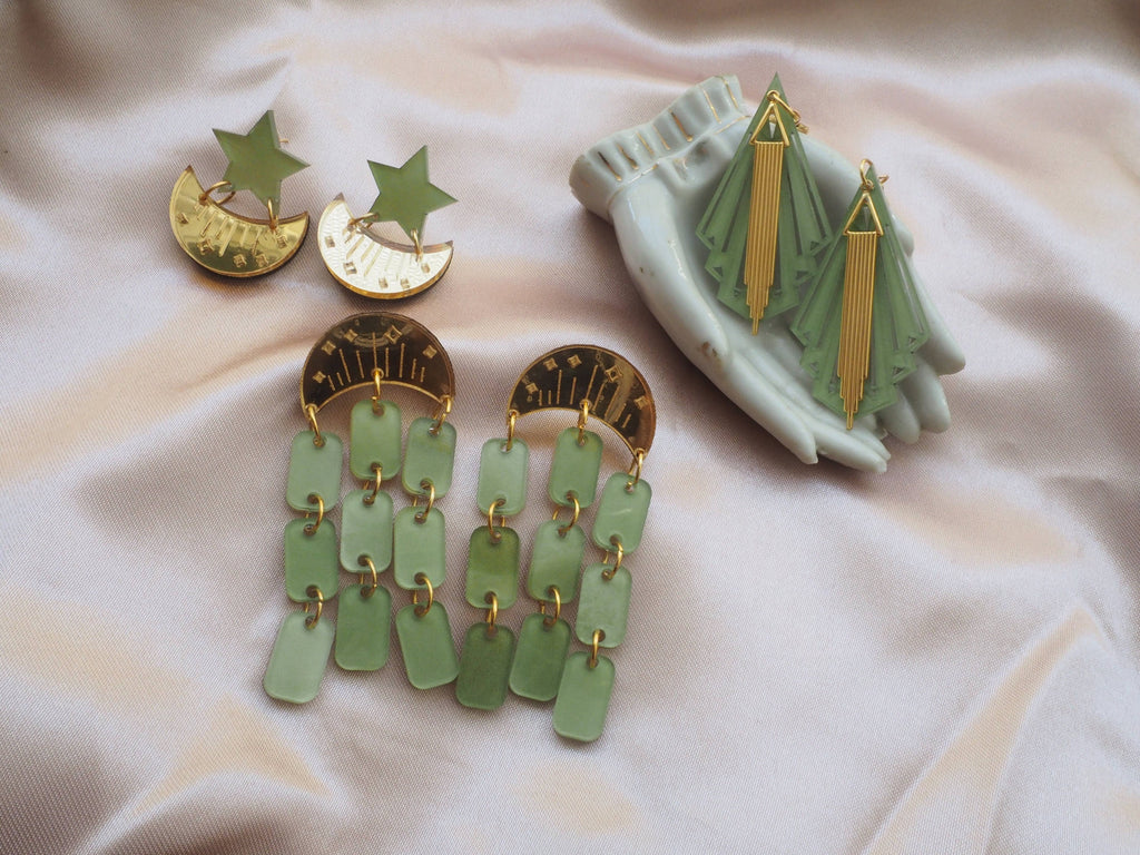 Jade colored acrylic components with subtle moon and star variations engravings or gold plated art deco accents.