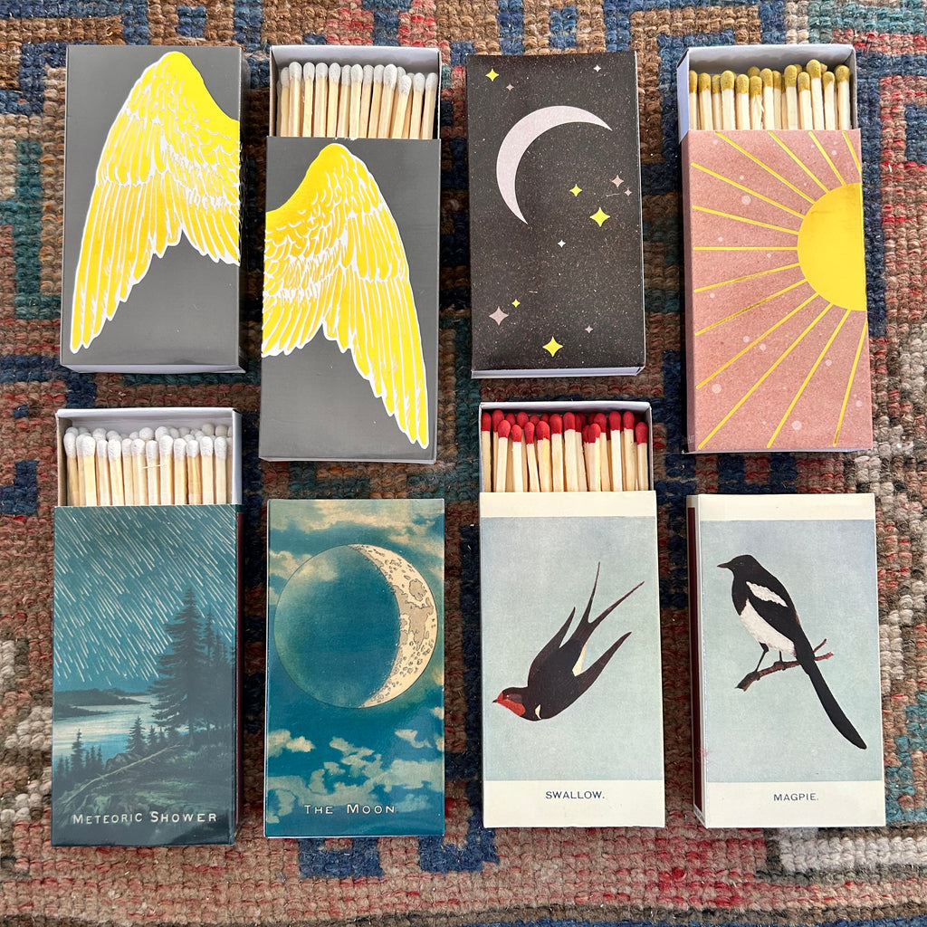 A quintessential article of daily use, our Match Boxes flaunt unique designs with coordinating match tips. Sweet as a hostess gift, a perfect pairing to a candle and always an eye catching pop of graphic decor. Safety matches, 50 sticks per box.